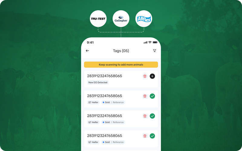 Adding animals is now quicker and more efficient. Simply scan the EID tag using your Bluetooth reader while creating a new animal record. The tag number is captured automatically, reducing setup time and minimizing the risk of entry errors. This is especially useful during onboarding, large herd additions, or when working through animals quickly in pens or yards.