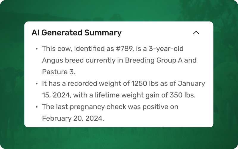 Each animal profile now includes an AI-generated summary that highlights key information such as origin, health status, performance indicators, and upcoming tasks. This gives you an instant overview without manually reviewing multiple records.