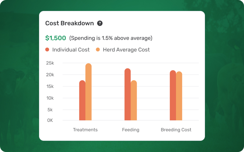 Understand profitability at the animal level by comparing feeding, breeding, and treatment costs against farm averages. This clear cost breakdown supports better financial evaluation and decision-making across the herd.