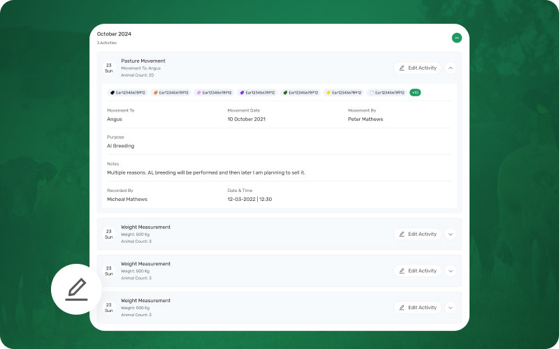 You can now fix errors or update details in past activity records whenever needed, reducing long-term inaccuracies in animal histories.